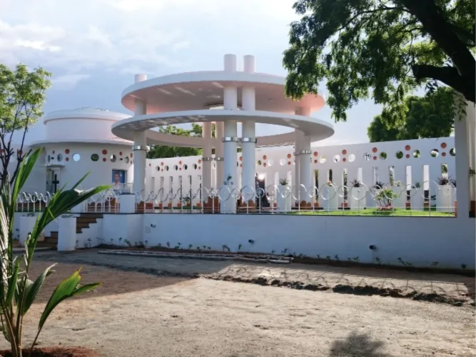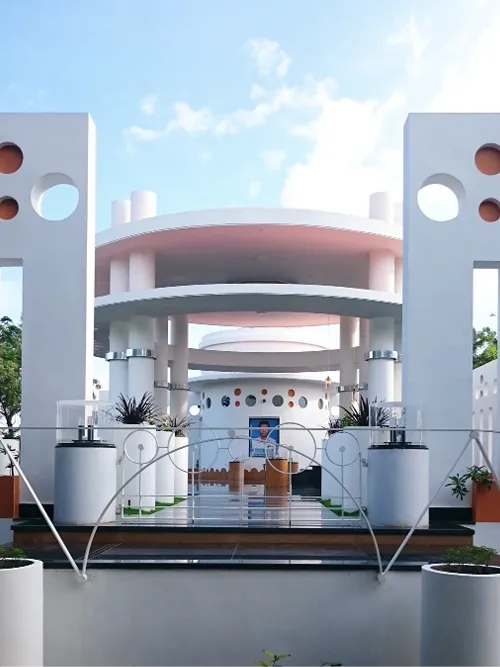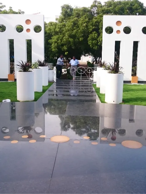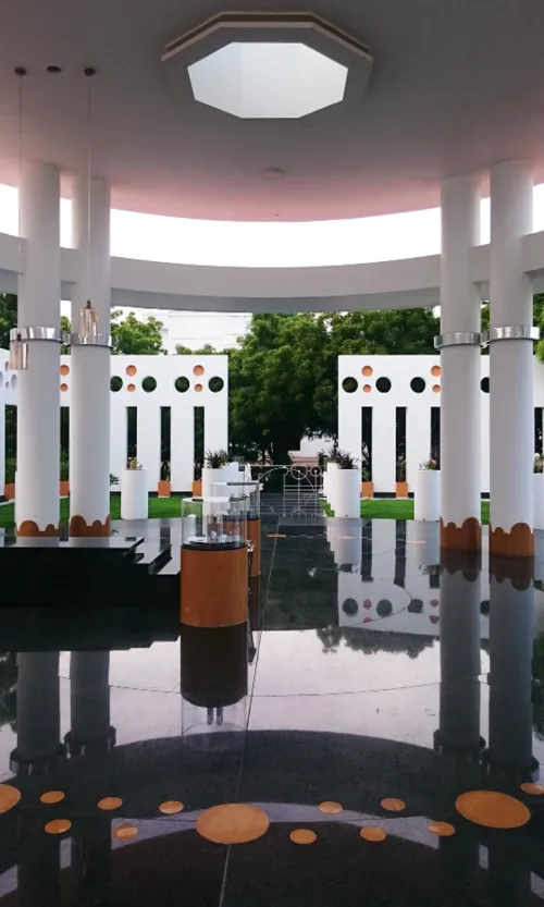 Arun Memorial is an ‘ode’ from a father to his beloved son. Our approach to the memorial investigates the design potential of a ‘circle’ - which represents notions of totality, infinite eternity, timelessness & focus. This 5,000 sft of built space has been elevated with an identifiable character achieved using circles of different diameters in repetitive patterns. Arun’s photo has been strategically located to create a focus point along the central axis. An octagonal skylight has been provided on the circular roof of the central podium for natural light to filter in & rain drops to reach the tombstone through the circular aperture right above. Natural light penetrating through the octagonal skylights adds to the ambience of remembrance.