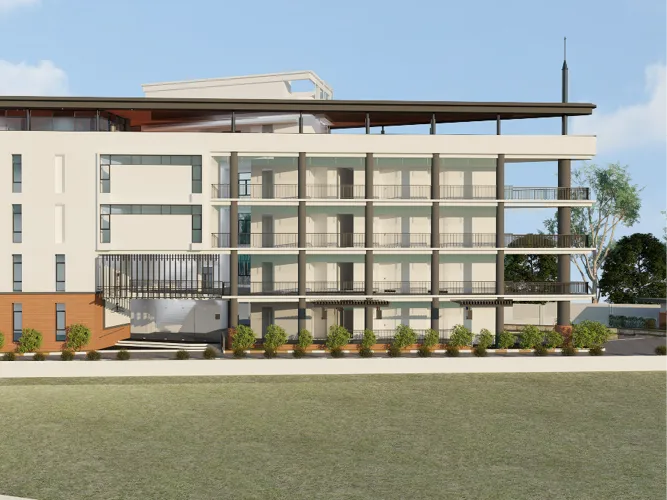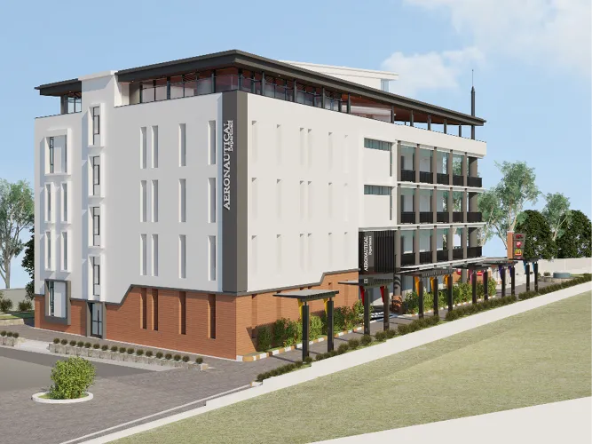 The proposed classroom block for the Aeronautical Department at NITTE, embraces the challenges of a corner site by embodying the triangular geometry in its planning. The large site setback areas are utilized as landscape pockets. The corner of the triangular building is emphasized with fileted edges and a circular column.The water feature in the north corner acts as a focal point for the pergola-d walkway towards the east edge. The central bay (containing the staircase) divides the triangular floor plan into 2 parts; the classrooms & seminar halls towards the South and the Staff rooms & Toilet block towards the north. Viewing galleries/corridors on every floor and the recessed windows maximize natural light into the building. The stepped seating in the open amphitheater towards the west offers a variation in the learning environment acting as a platform for interaction.