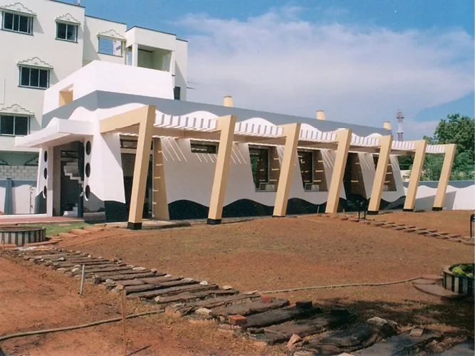 The self-stable tapered form of the building houses 2 cabins, a staff area and covered parking. The building has been layered to create multiple interpretations of the same space. The elevated plinth defines a transitional space; a blurred line between the inside & the outside.