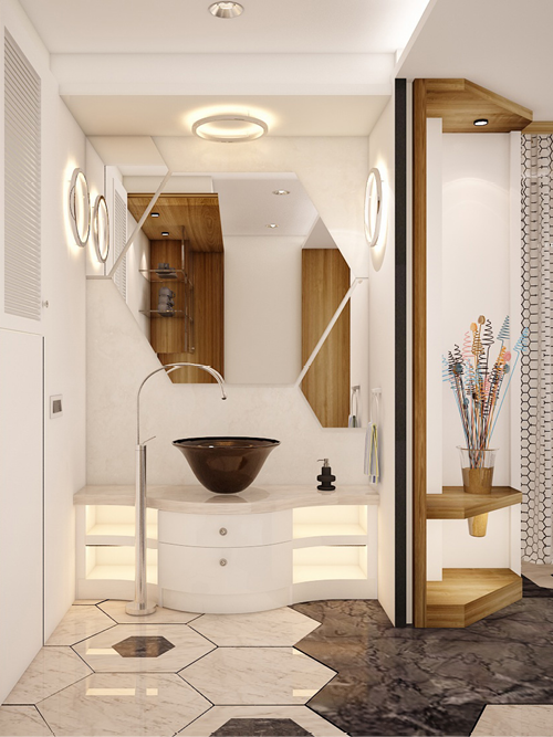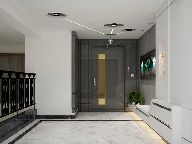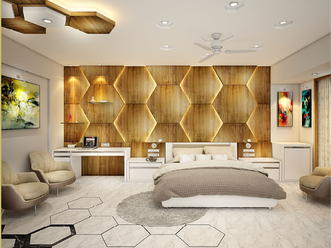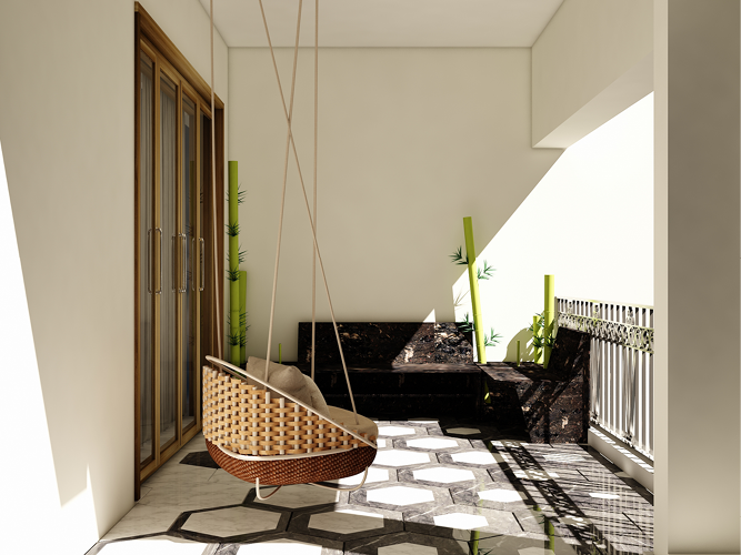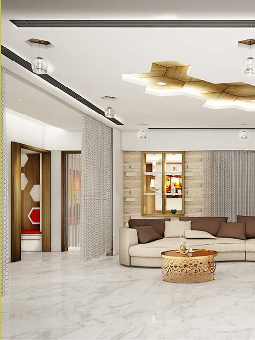 The Hanumantha Rao Apartment uses warm neutral undertones along with an overarching hexagonal theme. On entering the house, one experiences different spaces through change in material & accents. The patterned hexagonal inlays provide the right amount of style to this otherwise minimalist decor & instantly creates a distinctive focal point. The shape hexagon’s occurrence in a wide range of natural objects & processes make them inherently familiar & comforting & therefore has been used as geometrical theme in this house. This overarching theme has been molded in different ways to create statements ranging from delicate to bold, according to the demand of the space.