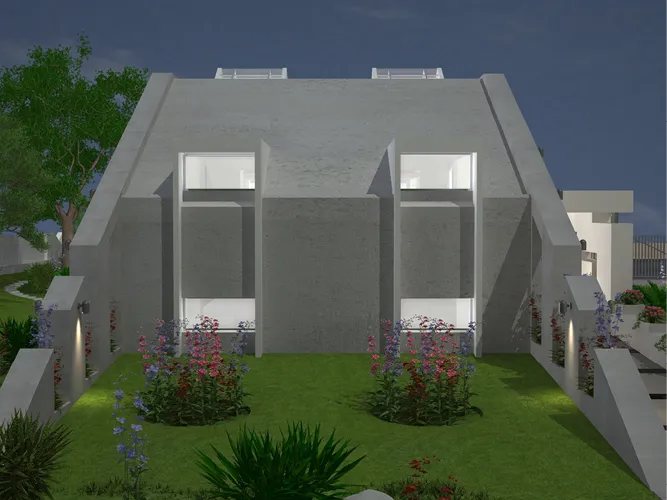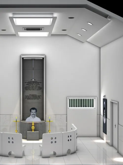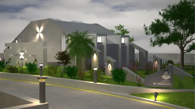 The memorial sits amidst a tranquil setting, with dense landscaping around the built. The Tapered form of this memorial signifies the strength & stability of Petchimuthu’s life. White undertones represent purity & simplicity and it brings freshness to the space. The Main Hall within the Petchimuthu Memorial is flanked by the meditation chamber on one side and photo gallery & collectibles on the other. Skylights on either side of the elevation are strategically located to allow natural light to filter into the space & have a cosmic connect.
