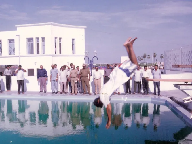 This recreation center was the 1st public sports facility in OA's portfolio. A consortium of 5 individuals floated an idea to set up a Recreation centre, first of its kind in Thoothukudi. The design was conceptualized keeping in mind simple functionality and a segregation of outdoor and indoor activities through a balance between the built and unbuilt form. The swimming pool, raised from the ground level based on the area's water table, is one of the center's main attractions; the skating rink is another. A curvilinear building was conceptualized facing the swimming pool to accommodate indoor games and this building had a circular tower with a domical skylight at the corner to house the staircase within & also served as a medium to elevate the signage.