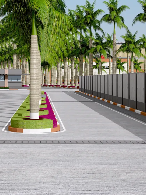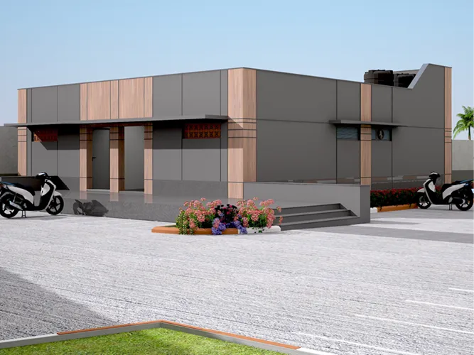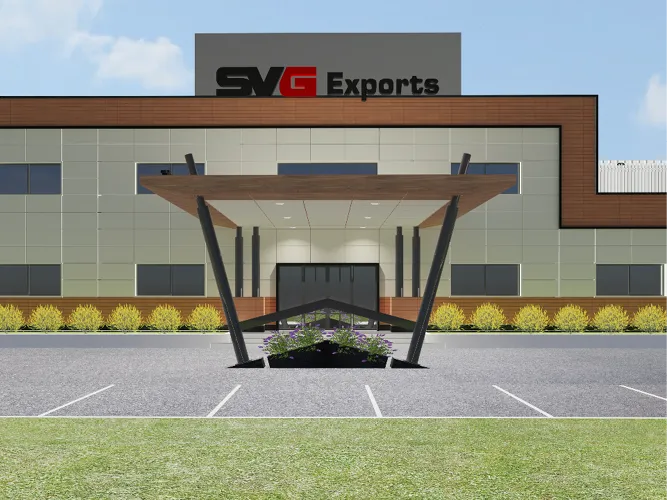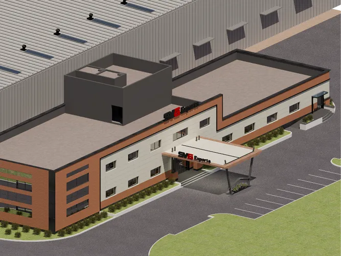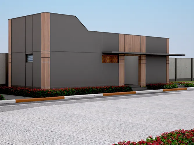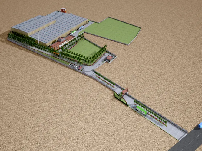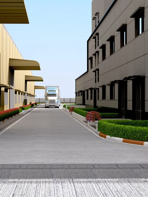 The industrial campus for SVG Exports is designed to be a quartz and lvt manufacturing unit which consists of peb buildings, an admin + cafeteria building and other adjoining ancillary buildings. A landmark entrance archway into the industrial campus is designed as a bold and visible statement of arrival. The admin block exteriors along with its entrance canopy has been designed with a material palette that uses a combination of ceramic and acp cladding, keeping the appearance geometrical and minimal.